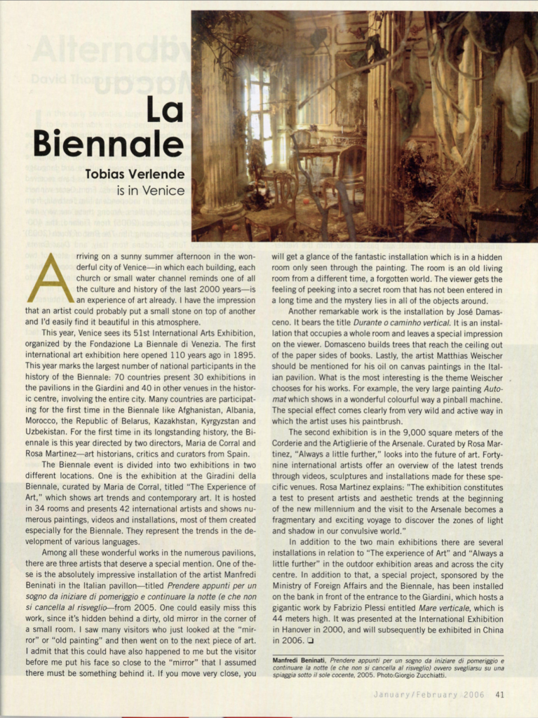 (…)Among all these wonderful works in the numerous pavilions, there are three artists that deserve a special mention. One of these is the absolutely impressive installation of the artist Manfredi Beninati in the Italian pavilion – titled Prendere appunti per un sogno da iniziare di pomeriggio e continuare la notte (e che non si cancella al risveglio) – from 2005.